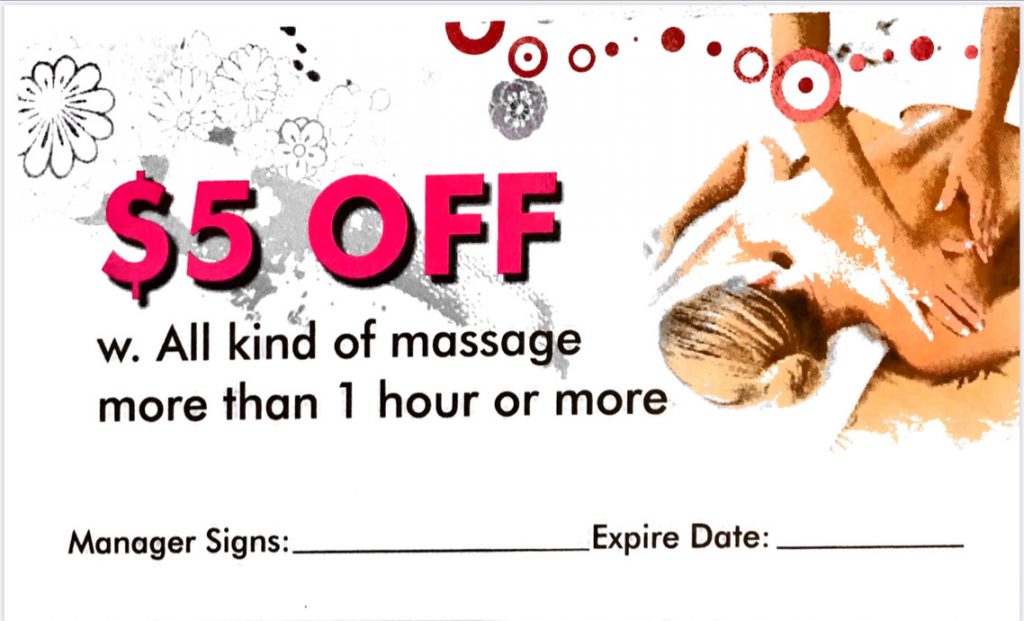 For a limited time, you will receive a $5 discount on any massage session lasting sixty minutes or more!